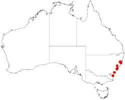 This species of Bertya is found in deep, moist sandstone gullies in rainforest and eucalypt forest in coastal and near-coastal areas of New South Wales between Wauchope and Batemans Bay.[2][3]