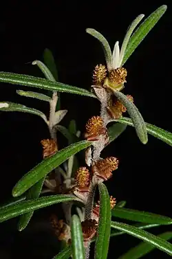 Bertya oleifolia is a shrub that typically grows to a height of up to 2.5 m (8 ft 2 in), its young branchlets densely covered with white, star-shaped hairs. The leaves are linear to lance-shaped with the narrower end towards the base, or narrowly elliptic, 25–54 mm (0.98–2.13 in) long and 2–8 mm (0.079–0.315 in) wide with the edges curved dow or rolled under. Separate male and female flowers are borne on a peduncle up to 1.5 mm (0.059 in) long, the male flowers 45 to 75 stamens. Female flowers are sessile, with narrowly egg-shaped sepals 3.3–4.5 mm (0.13–0.18 in) long and a densely hairy ovary. Flowering occurs from May to November, and the fruit is elliptic, 6.9–8.5 mm (0.27–0.33 in) long with a single seed.[2][3]