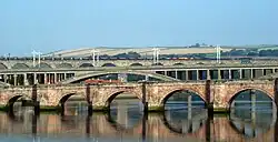 The bridge is now one way, from east to west. A short distance upstream is the Royal Tweed Bridge, which succeeded the Berwick Bridge as the main road crossing of the Tweed at Berwick when it opened in 1928.[11] In 1984, the A1 River Tweed Bridge opened about a mile to the west of Berwick, carrying the A1 road around the town.[9]