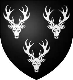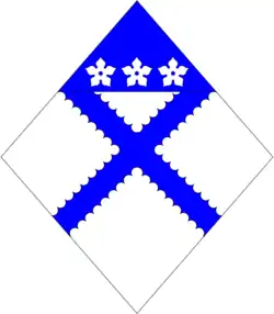The Hardwicks had arrived in Derbyshire from Sussex by the mid-thirteenth century, and farmed land granted by Robert Savage, lord of the manor of Stainsby, on the north-east border of Derbyshire, looking over Nottinghamshire. By the mid-fifteenth century the family had risen to "gentleman-yeoman" stock, with an estate of a few hundred acres located mainly in the parish of Ault Hucknall in the manor of Stainsby. The Hardwick coat of arms of Hardwick was probably granted c. 1450 to William Hardwick. The blazon is: Argent, a saltier engrailed azure on a chief of the second three cinquefoils of the first.[2] When giving evidence of his right to arms in 1569, Bess's only brother, James Hardwick (1525-1580/1), provided the heralds with a pedigree of his family which began with this William, who died c. 1453.