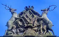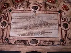 Bess of Hardwick died at 5 pm on Saturday 13 February 1608, aged c.87. At the time of her death she remained "one of the richest, and most powerful women in the kingdom".[13] On 16 February her body was placed in a vault in All Saints Church, Derby, then the parish church of that city (demolished 1723 and rebuilt, since 1927 Derby Cathedral), under an elaborate monument with a laudatory inscription which she took care to put up in her lifetime.[25] The monument with effigy survives, having been saved from the former demolished building. Stories of her body lying in state for weeks in the Great Chamber at Hardwick are mythical.[31] Her accumulated estates were left to her children from her second marriage.[25]