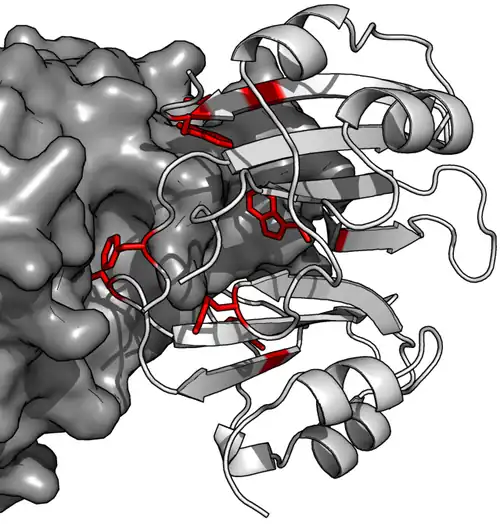 Beta-lactamase Inhibitory Protein (white) complexed with beta-lactamase (grey) with key interaction residues highlighted (red). (PDB: 3C7V​)