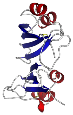 Beta-Lactamase Inhibitory Protein (BLIP) with α-helices in red, β-sheets in blue, disulphides in yellow. (PDB: 3C7V​)