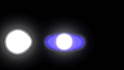 Beta Lyrae type eclipsing binary star. Heavier, whiter component is surrounded with a gas ring. Gas comes to teardrop shaped secondary component.