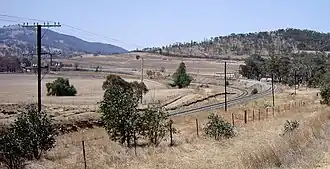 There are other spots on that road from where three railway tracks can be seen at three different heights on the adjacent hillside to the east of the Olympic Highway. The bottom and top tracks are the "up" (northbound) track before and after it has crossed the "down" (southbound) track and traversed the Spiral, while the middle track is the original single-track line, which is now the "down" (southbound) track.