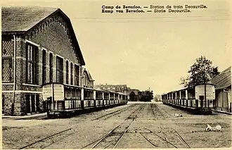 ![]() Decauville railway station at Beverloo Camp, 1920s [1] ![]() Route of the main line, as shown on a 1970s map | ||||||||||||||||||||||||||||||||||||||||