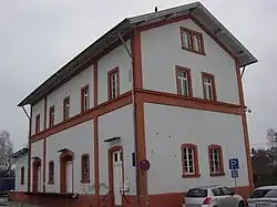 Bexbach station is a station in the German state of Saarland. It was opened in 1849 and is the oldest preserved station building in the state, although it has extended in 1872 and 1896. When it was built, Bexbach was in the Circle of the Rhine (Rheinkreis) of the Kingdom of Bavaria. It was put into operation together with Homburg Hauptbahnhof and the Palatine Ludwig Railway (Pfälzische Ludwigsbahn). Homburg station, which was destroyed during the Second World War, received a new entrance building at the beginning of the 1950s, but Bexbach station was preserved. When it was built, it was a border station between Bavaria and Prussia and also the terminus of the historic Palatine Ludwig Railway. Today, it is a through station on the Homburg–Neunkirchen railway. The building and its surrounding area have been given heritage protection.[4]