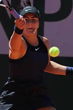 Andreescu began playing tennis in her parents' home country of Romania before returning to Canada, the country of her birth.[4] She had success as a junior, winning the Orange Bowl and two major doubles titles with compatriot Carson Branstine en route to reaching a career-best junior ranking of No. 3 in the world. After not playing any matches at the WTA Tour level in 2018, Andreescu had a breakout year in 2019. She rose to prominence by winning the Indian Wells Open, a Premier Mandatory tournament, and later swept the Canadian Open and US Open events, defeating Serena Williams in both finals. Although she missed several months due to injury, Andreescu qualified for the WTA Finals at the end of the season and finished the year ranked No. 5.