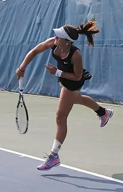 Andreescu won two more 25k titles in early 2017, which helped her break into the top 200 of the WTA rankings.[31][35] After losing in qualifying at the French Open, she was able to qualify for the main draw at Wimbledon. She lost her Grand Slam debut to No. 105 Kristína Kučová.[36] Later in the month, she was awarded a wildcard into the main draw of the Washington Open. She defeated Camila Giorgi in the opening round, her first win on the WTA Tour. In her next match, she upset world No. 13, Kristina Mladenovic, to advance to the quarterfinals, where she lost to Andrea Petkovic.[37][38] A few weeks later, she made her Canadian Open main-draw debut as a wildcard entrant, losing to No. 55 Tímea Babos.[39] Andreescu entered qualifying at the US Open, but lost her opening match. In the last stage of the season, she had more success in doubles. She reached her first WTA final in doubles with compatriot Carson Branstine at the Tournoi de Québec. They finished runners-up to top seeds Tímea Babos and Andrea Hlaváčková.[40] She then partnered with compatriot Carol Zhao to win the doubles title at the $60k Challenger de Saguenay.[31] Andreescu's best ranking during the year was No. 143, and she finished the season at No. 182.[35]