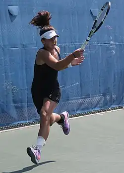 Andreescu has multiple options with her forehand, including hitting it flat, with slice, or with heavy topspin to push her opponents further back behind the baseline.[48][114] She also has multiple options with her two-handed backhand, and is capable of hitting it flat at sharp angles, with power, or one-handed with slice.[48] Andreescu can hit large numbers of winners, most of which are typically from the forehand side. She hit 19 winners in the 2019 US Open final[115] and 44 in the 2019 Indian Wells final, 37 of which were forehand winners.[114][116] Andreescu frequently incorporates well-disguised drop shots to change pace and keep her opponents out of rhythm. She also can hit moonballs on occasion for the same purpose.[48][112][114] Following a loss to Andreescu at the 2019 US Open, Caroline Wozniacki likened her style to that of Kim Clijsters, one of Andreescu's childhood tennis idols, saying "I think because [Andreescu] moves well and she can stretch out and get to some balls and also play the aggressive and using the angles. Obviously she prefers the forehand just like Kim... But she can move around the backhand and put the angle on it."[117]