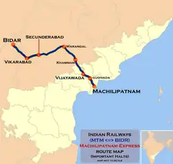 This train runs via Secunderabad, Warangal and Vijayawada. The table shows the list of stations between the two nodal stations.[4] The train was extended up to Bidar from 1 March 2018. From 2022, the route has been electrified till Bidar and operational. A WAP7 or WAP4 is used to haul this Superfast express 12749/50 from BIDAR to MACHELIPATNAM and back.
