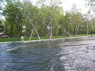- Sycamore Pool, located in the One Mile Recreation Area. The creek was dammed by the city in the 1920s; but the pool was cemented and finished out by the Works Progress Administration (WPA) in the 1930s, as part of several WPA improvements to Bidwell Park. There are tile depth markers every six feet or so along the pool’s edge. The lifeguard chairs look original, but that is uncertain. A bridge across the dam was built later using state Land & Water Conservation Funds.[2] The pool provides a unique swimming experience because its concrete decks, walls, and bottom are built to contain Big Chico Creek as it flows through the park. A dam and fish ladder at one end allow control of the creek's flow. The dam is raised and lifeguards are present from Memorial Day to Labor Day of each year. Above the fish ladder there is a bridge that separates the pool and the creek, from which many locals feed sucker fish in the bottom of the fish ladder. Locals often refer to Sycamore Pool simply as One Mile.