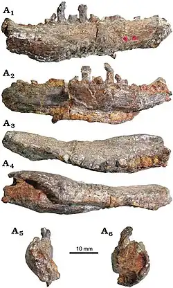 The Lufeng Basin in China has been a location for the collection of Early Jurassic dinosaurs since 1938. In 1938 and 1939 Chinese paleontologist Mei Nien Bien collected material from the Dark Red Beds of the lower Lufeng Formation that included the nearly complete jaw and partial skull of a relative of the armored dinosaur Scelidosaurus, though it was not described as such until 2001. In 2001, Chinese paleontologist Dong Zhiming described this specimen, IVPP V 9612, as a new member of the family Scelidosauridae, Bienosaurus lufengensis. The genus name is in honor of the collector Bien and combines with it the Ancient Greek word σαυρος (sauros) for "lizard", while the specific name is for the Lufeng Basin where the holotype skull was found.[1] The species name was originally going to honor Michael Crichton, author of Jurassic Park, as "Bienosaurus crichtoni".[2] As it comes from the lower Lufeng Formation, Bienosaurus would be one of the earliest known ornithischians, living in the Hettangian to Sinemurian of the Early Jurassic.[3]