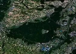 The Bienwald is a large forested area in the southern Pfalz region of Germany near the towns of Kandel and Wörth am Rhein. The western edge defines the eastern extent of the Wissembourg Gap, a corridor of open terrain between the Bienwald and the hills of the Palatine Forest. In the northwest, the forest is bounded by the so-called "Cattle Line" (German: Viehstrich), running from Schweighofen to Kandel. In the north, the forest reaches as far as Hatzenbühl and Rheinzabern. The eastern boundary largely runs along the bank of the Rhine from Jockgrim to Hagenbach and Berg (Pfalz). The southern boundary follows the valley of the Lauter along the border of France and Germany. The bulk of the forest belongs to the municipality of Wörth am Rhein. At its greatest extent, the Bienwald is approximately 17 kilometres (11 mi) wide along its east–west axis and 11 km (6.8 mi) from north to south. The forest has an area of some 163 km2 (63 sq mi). Approximately one-third of the forest is deciduous woodland with the remainder coniferous. The forest has an elevation of 100 metres (330 ft) above sea level by the Rhine, and rises to 150 m (490 ft) above sea level in its western extremities.