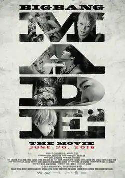 Big Bang Made is a 2016 South Korean documentary film featuring popular boy band Big Bang on their tour, the Made World Tour in 2015, which became the most attended tour headlined by a Korean act in history. It was released in South Korea and Japan on June 30, 2016.[5] It is the band's first film, released to celebrate the tenth anniversary of their debut.