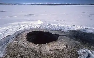 Big Cone is a 7 metres (23 ft) wide sinter cone that rises from Yellowstone Lake about 7 metres (23 ft) from the shoreline. The vent of the cone is 80 centimetres (31 in) wide.[1] At times of increased water level in the lake, the cone may be submerged completely.[1][3] Big Cone is known to undergo rare eruptions 1 foot high or less.