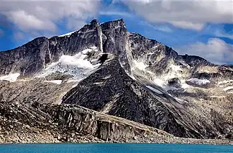 Big Snow Mountain is a glaciated peak situated in the Coast Mountains, in a remote wilderness area that few visit. Big Snow is set 16 km (9.9 mi) south-southeast of Bella Coola and 430 km (270 mi) northwest of Vancouver. Precipitation runoff and glacier meltwater from Big Snow drains to Thorsen Creek → Bella Coola RiverNorth Bentinck Arm, and to South Bentinck Arm via Brynildsen Creek → Smitley RiverNoeick River. Topographic relief is significant as the summit rises 1,550 meters (5,085 feet) above Brynildsen Creek in 2.5 kilometers (1.55 mile). The mountain was named by a 1951 climbing party,[4] and the landform's toponym was officially adopted April 15, 1984, by the Geographical Names Board of Canada.[3]
