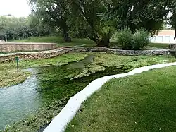 Big Spring Creek (Gros Ventre: ʔinííθɔ́ɔwuh, lit. 'warm water'[3]) is a tributary of the Judith River in Fergus County, Montana near Lewistown, Montana. The creek originates from a first magnitude artesian spring approximately 6 miles (9.7 km) south of Lewistown and flows north, northwest for 30 miles (48 km)[4] to its confluence with the Judith River.[5] The spring is one of the largest in the world flowing at approximately 50,000 to 64,000 US gallons (190,000 to 240,000 L) per minute[6] out of the Madison-Limestone formation in the foothills of the Big Snowy Mountains. The creek flows through and under the town of Lewistown. For three blocks spanning Main Street, the creek runs underneath the town in a man-made channel that was created as the town was built over the creek.[7] The spring provides Lewistown's water supply, which requires no treatment for use by consumers.