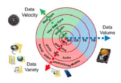 Big data analysis challenges include capturing data, data storage, data analysis, search, sharing, transfer, visualization, querying, updating, information privacy, and data source. Big data was originally associated with three key concepts: volume, variety, and velocity.[2] The analysis of big data presents challenges in sampling, and thus previously allowing for only observations and sampling. Thus a fourth concept, veracity, refers to the quality or insightfulness of the data.[3] Without sufficient investment in expertise for big data veracity, the volume and variety of data can produce costs and risks that exceed an organization's capacity to create and capture value from big data.[4]