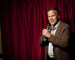 Dwyer hosted five seasons of the Comedy Central show BattleBots from 2000 to 2002.[4][5] He was the play-by-play announcer for the Game Show Network's Extreme Dodgeball in 2004,[14] and in 2006, he hosted a remake of the panel show I've Got a Secret whose twist was that all the featured panelists were gay.[15] The series ran for 40 episodes and was canceled after one season, but the Hollywood Reporter praised Dwyer's performance as host, calling him "affable and fast with a quip."[16] Other shows Dwyer has hosted include Dirty Rotten Cheater for PAX/Ion Television in 2003,[17] the FSN sports-trivia show Ultimate Fan League, as well as a YouTube series about golf, The Range with Bil Dwyer.[18] He hosted the 2005 series MTV's The 70s House in character as the intentionally cheesy "Bert Van Styles".[6]