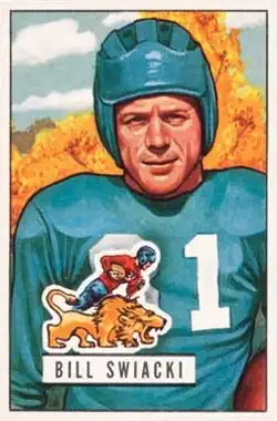 William Adam Swiacki (October 2, 1922 – July 7, 1976) was an American football player and coach. He played college football as an end for Columbia University in 1946 and 1947 and was a consensus first-team All-American in 1947. He played professional football in the National Football League (NFL) for the New York Giants from 1948 to 1950 and for the Detroit Lions in 1951 and 1952. He was a member of the Lions' 1952 team that won the NFL championship.