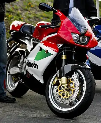 Bimota first experienced international racing success in 1980 when privateer Jon Ekerold won the 350cc world championship on a Yamaha-powered Bimota.[3] They also experienced success in the early years of the Superbike World Championship. Virginio Ferrari won the 1987 Formula TT title aboard a YB4 EI, partnering with Davide Tardozzi. Tardozzi won five races in the inaugural 1988 world superbike championship, more than any other competitor, but inconsistent results relegated him to third place in the final standings.[4]