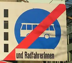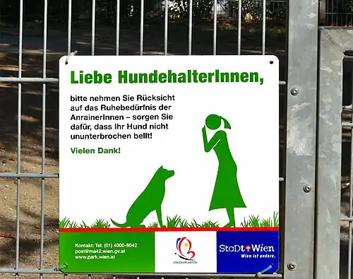 - ^ Hundehalter is "dog owner", and HundehalterInnen is "male and female dog owners". In the full size image you can see AnrainerInnen (neighbors) as well. (The sign requests owners to keep their dogs from continuous barking for the sake of the neighbors.)