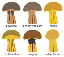 Specimens of Bipalium adventitium are characterized by a single dark dorsal stripe. They were first discovered in the US in California and New York[26] but have been found in Illinois[27] as well as most northern states.[6] In 2019, they were discovered in Montreal, Canada.[28] B. kewense have five dark dorsal stripes and a partial dark collar. They have undergone several name changes since their discovery in North America. B. kewense is commonly found across the southern regions of the US.[16] B. kewense is found worldwide in tropical and subtropical regions.[15] Bipalium pennsylvanicum is characterized by its dark brown head and three dorsal stripes. As of 2014, it has only been found in Pennsylvania[29] and in coastal South Carolina. Bipalium vagum is characterized by two dark dorsal blotches on the head, a thick black band around the neck, and three dark dorsal stripes. This species has been found in several Gulf Coast states,[11] and in 2022, specimens were located extending further north into Arkansas.[30] Recently, it was found in Mumbai, India.