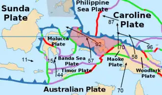 The plate is separating from the Australian plate and the small Maoke plate along a divergent boundary to the southeast. Convergent boundaries exist along the north, between the Bird's Head and the Caroline plate, the Philippine Sea plate and the Halmahera plate to the northwest. A transform boundary exists between the Bird's Head and the Molucca Sea Collision Zone to the southwest. Another convergent boundary exists between the Bird's Head and the Banda Sea plate to the south.[3]
