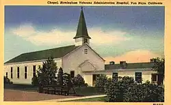 After the war on 31 March 1946, the hospital was turned over to the Veterans Administration and renamed Birmingham Veterans Administration Hospital. The veterans' organization Paralyzed Veterans of America was started at this hospital.[14] The VA Hospital closed in 1950, the Vets at Birmingham were moved to the Veterans Administration Long Beach Hospital. In 1952 the hospital was sold to the Los Angeles City Schools for $1.00. Los Angeles City School opened Birmingham High School - Birmingham Community Charter High School (BCCHS) on 1953, it served grades seven to 12. Mrs. Albert Zoraster, a member of the Havenhurst Elementary School P.T.A, was credited with having the vision of using the former hospital as a school. Congressman Joseph F. Holt helped make her vision a reality. The school's principal, Dr. John I. Abbott, quickly transformed the shuttered hospital grounds into a school facility. For example, the chapel was converted into a drama classroom. Some original VA buildings, along with the old pools, are still on the high school campus. The land also is used for the current Mulholland Junior High - William Mulholland Middle School.[15][16][17][18]