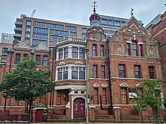 The hospital was one of a number of specialist hospitals founded in Birmingham in the late nineteenth century. The Birmingham and Midland Skin and Lock hospital was established in 1880 to treat people with both skin diseases and venereal diseases.[1] By 1887–1888 a purpose built hospital designed by James and Lister Lea was built in John Bright Street to replace the small house in which the hospital had been established.[2] By 1895 this was called the Birmingham and Midland Skin and Urinary Hospital and was also treating people with illnesses of the urinary tract.[1] Today patients are treated at the new Queen Elizabeth Hospital Birmingham.