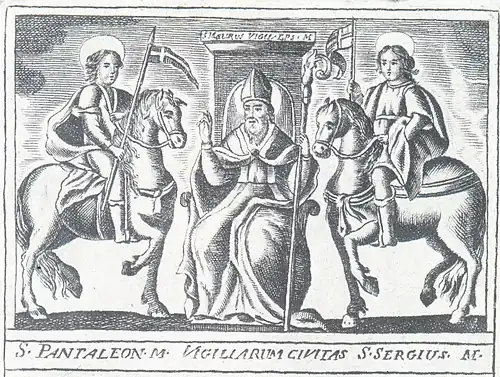 According to the tradition reported by Armando, bishop of Bisceglie, in the time of Emperor Trajan two noble Roman knights, Sergius and Pantalemon, were won over by the words of Maurus of Bethlehem, a bishop preaching Christianity. Having converted to the new faith, the three were arrested and sentenced to death on 27 July 117. After their martyrdom, their remains were transported to the Bisceglie area in the Sagina district, where a Christian widow, Tecla de Fabiis, placed them in a tomb that she had had built. Slowly the worship of the three patron saints began to spread in the newly formed maritime village of Bisceglie. On 9 June 1167, under the bishop Amando, the sacred relics of the three martyrs were transported inside the walls of Bisceglie, and initially kept in the church of San Fortunato, near the castle. Later the bones were transported to the church of San Bartolomeo and, finally, on 30 July 1167 they were transported to the cathedral of Bisceglie. Here, they were placed in three stone urns under three altars, in a specially constructed crypt.[22] This consecration was significant enough to be attended by local and regional ecclesiastical dignitaries, including the bishops of Cannae, Polignano a Mare, and Ruvo di Puglia (suffragans of Bari, the bishop of Vieste (suffragan of Siponto), and the archdeacon of Trani, besides other minor officials and many lay people. The inventio of the remains and the report on the translatio and the solemnities is found in the Acta Sanctorum, July vol.6, 352-374.[23]