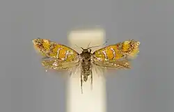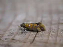 The wingspan is 11–13 mm. The moth flies from June to August depending on the location.[1]