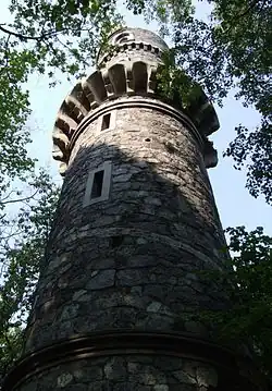 A Bismarck tower (German: Bismarckturm) is a specific type of monument built according to a more or less standard model across Germany to honour its first chancellor, Otto von Bismarck (d. 1898). A total of 234 of these towers were inventoried by Kloss and Seele in 2007[1] but more have been discovered since making the total around 240.[2][3] These towers were built between 1869[4] and 1934 and some 173 remain today.[1][5] Quite a few of these towers, including all 47 based on Wilhelm Kreis's Götterdämmerung design,[6] were built as so-called Bismarck Columns (Bismarcksäulen) or were converted into them. This description goes back to the Student Union's competition held in 1899,[7] which was to encourage the erection of as many beacons as possible (and not observation towers). But other Bismarck towers, e.g., those that were purely beacons with no observation function, were often called Bismarck columns.
