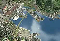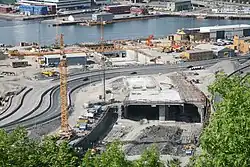 The Bjørvika Tunnel (Norwegian: Bjørvikatunnelen) is a motorway immersed tunnel on European Route E18 in the city center of Oslo, Norway. The tunnel has two bores, with three lanes in each. In the west, it connects to the Festning Tunnel at Akershus Fortress and runs under the Bjørvika arm of the Oslofjord before ending in an intersection on the east shore, where it splits into Mosseveien (E18) and the Ekeberg Tunnel (National Road 190). The tunnel is 1,100 metres (3,600 ft) long, 675 meters of which run below sea level, and opened in September 2010. It was built by the Norwegian Public Roads Administration.[1] The Bjørvika Tunnel is part of the Opera Tunnel complex which is the name of the interconnected system of tunnels between Ryen and Filipstad. The Bjørvika Tunnel is the first immersed tunnel in Norway.