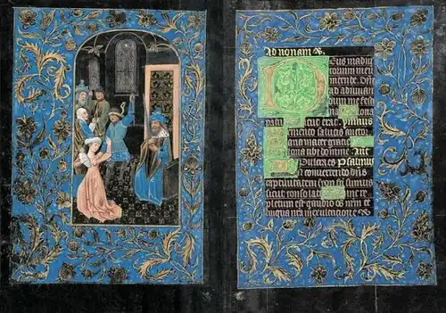The miniatures depict scenes from the lives of the Virgin and Christ and are placed to the left (verso) pages of the book, mostly against calendar representations of days from the liturgical year. The illuminations include biblical figures dressed in contemporary late medieval or Gothic dress. In folio 76v, David wears the ceremonial robes of a 15th-century monarch.[11] The decorations on the borders are particularly vivid in detail.[17]