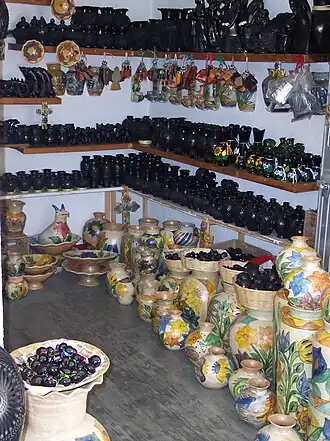 Barro negro pottery ("black clay") is a style of pottery from Oaxaca, Mexico, distinguished by its color, sheen and unique designs. Oaxaca is one of few Mexican states which is characterized by the continuance of its ancestral crafts, which are still used in everyday life.[1] Barro negro is one of several pottery traditions in the state, which also include the glazed green pieces of Santa María Atzompa;[2] however, barro negro is one of the best known and most identified with the state.[3] It is also one of the most popular styles of pottery in Mexico.[4] The origins of this pottery style extends as far back as the Monte Albán period. For almost all of this pottery's history, it had been available only in a grayish matte finish. In the 1950s, a potter named Doña Rosa devised a way to put a black metallic-like sheen onto the pottery by polishing it before firing.[3][5] This look has increased the style's popularity. From the 1980s to the present, an artisan named Carlomagno Pedro Martínez has promoted items made this way with barro negro sculptures which have been exhibited in a number of countries.[6]