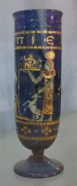 Libyan Greek religion was directly influenced by Ancient Egyptian religion. The Cyreneans assimilated the Egyptian god Amun with Zeus as "Ammon", embodying Zeus in his style and Amun in his nature, attributing the horns of a ram to his image.[39][40][41]