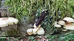 The black slug is mainly nocturnal and avoids exposure to sunlight, although in introduced areas, it has been observed to be active all parts of the day and night. It is omnivorous,[17] eating carrion, fungi, animal feces, algae, lichen, and vegetation (living or decaying). These slugs prefer to eat on cloudy days or at night when temperatures are above 10 degrees Celsius. Mucus-production necessitates moist habitats, such as among leaf-litter, mosses, or fallen trees. Consequently, the black slug becomes most active after rainfall. A 1976 study compared black slug assimilation rates to that of similar slugs in the UK.[18] The study determined the black slug feeds at similar rates to other European slugs (in terms of biomass), suggesting the black slug is an equally important decomposer/consumer in forest systems. The study theorized these high assimilation rates might result from abundant enzymes in slug digestive systems: amylase, invertase, cellulase, xylanase, and chitinase. The last might be especially indicative of how these slugs can consume large quantities of fungi such as Armillaria mellea.[18] Microbiota within black slug digestive systems produce these enzymes—such as the bacteria that produce cellulase—enabling the slugs to break down lignocellulose. A recent study further explored Arion ater’s gut microbiome and discovered the black slug to have far more bacteria within its gut than did neighboring, northern European insects, including members of the orders Coleoptera, Isoptera, Orthoptera, and Diptera. This study learned the black slug’s gut microbiome to be functional at a wide range of temperatures and pH levels, and its results suggest that the mycobacterial culture may be uniform throughout the black slug’s gut and that Gammaproteobacteria composes most of this culture. This study contrasted its results to studies of North American black slugs that presented higher levels of cellulolytic activity at a narrower pH range. In summary, Arion ater can digest diverse food material such as cellulose because gut bacteria produce digestive enzymes.[19]