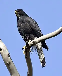 Typically, both sexes of the black sparrowhawk have a predominantly black plumage with a white throat, breast and belly.[5] These white-breasted individuals are known as "white morphs" which are in the majority over most of the birds' range. The "black morph" variety is generally rare,[2][5][6] except along the coastal regions of South Africa, including the Cape Peninsula where they constitute 80% of the population.[7][8] (Black sparrowhawks do not occur more than about 200–300 km north of Cape Town along the South African west coast, where there are almost no trees.) These "black (or dark) morphs", when seen perched, can be black all over, but more commonly have a few white spots on the breast or a white throat of variable size. In flight both morphs show white and black barring on the underside of the wings and tail (see picture). The black morphs are not melanistic, as commonly alleged, as their plumage is not completely black, nor are they black as chicks or juveniles. There is no noticeable difference between the plumage of mature females and males, which can only be distinguished by size.[5] The tails are cross-barred with about three or four paler stripes, and the undersides of the wings with perhaps four or five. The legs are yellow, with large feet and talons.[6]