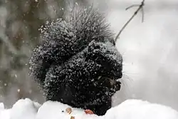 A black squirrel in winter in Stirling, Ontario. Heat retention in cold weather has been theorized as a benefit of melanism.