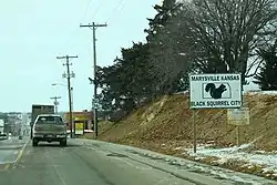 Signage in Marysville, Kansas featuring a black squirrel, the city's official mascot.
