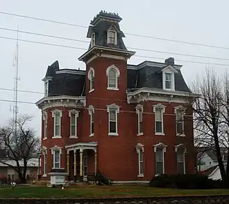 The Blair House of Washington, Iowa, formerly used as the town's City Hall, was built in 1881. It was listed on the National Register of Historic Places in 1973.[1] The building has served several different functions in its history.[2] It was built as a private residence by a local financier and realtor Winfield Smouse. The Blair family lived here from 1882 to 1891, followed by C.J. Wilson. It then housed the Commercial Club from 1903 to 1926 and they added a gymnasium and club rooms on the south side. The building housed the Washington City Hall from 1926 to 1972. They added a larger front porch, a fire station to the east side of the house and hung the fire bell in the tower.[3] It is one of the few Victorian houses that remains in this area.[2] The 2½ story structure follows an irregular plan. Its exterior is composed of brick and both the main block and the tower are capped with a mansard roof. Des Moines architect William Wagner said the Blair House is a "little gem-a miniature Terrace Hill",[3] a reference to the present Iowa Governor's Mansion.