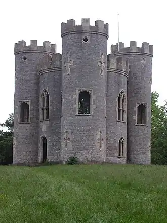 On a hill above the gorge is a sham castle in Gothic Revival style overlooking Bristol, Avonmouth and the Avon Gorge, with views across to South Wales on a clear day.[23] It was built in 1766, by Robert Mylne, on the site of a chapel dedicated to Saint Blaise.[1][24] The folly is reputed to have cost £3,000.[12] The circular building is built of local ashlar stone with limestone dressings. It has three turrets with crenellated parapets.[1]
