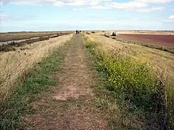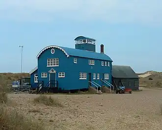 Norfolk Coast Path, an ancient long distance footpath, cuts across the south eastern corner of the reserve along the sea wall between the farmland and the salt marshes, and further west at Holme-next-the-Sea the trail joins Peddars Way.[8][10] The tip of Blakeney Point can be reached by walking up the shingle spit from the car park at Cley Beach,[2] or by boats from the quay at Morston. The boat gives good views of the seal colonies and avoids the long walk over a difficult surface.[11] The National Trust has an information centre and tea room at the quay,[12] and a visitor centre on the Point. The centre was formerly a lifeboat station and is open in the summer months.[13] Halfway House, or the Watch House, is a building 2.4 km (1.5 mi) from Cley Beach car park. Originally built in the 19th century as a look-out for smugglers, it was used in succession as a coast guard station, by the Girl Guides, and as a holiday let.[2]