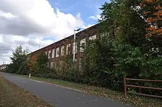 The Blakeslee Forging Company complex is located on the south side of the central village of Plantsville. It is set well back from the street, behind a municipal parking lot and the former Pultz & Walkley Company industrial complex. Its largest two buildings form a T, whose top runs parallel to the former railroad right-of-way that now serves as the Farmington Canal Heritage Trail. The top of the T is a two-story brick building, 20 bays long, with industrial Colonial Revival trim elements, while the leg of the T is a longer single-story brick structure with a gabled roof. Also facing the railroad right-of-way, north of those buildings, is a single-story six-bay brick building. Three smaller structures are tucked behind these, between the T and the adjacent buildings to the north.[2]