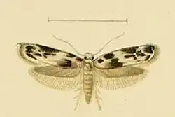 The length of the forewings is about 6 mm. The forewings are white, with blackish-brown markings. The hindwings are shining grey.[2]