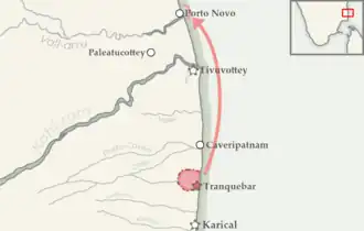 In March 1683, the Danes had a dispute with the local subahdar, Gopal Pundit, and besieged Porto Novo.[4] The warfare was conducted on the sea, and the Danes blockaded the Vellar River. Meanwhile, they held three or four Dutch vessels with the VOC's accounts, coming from Ceylon. The ships were only released upon a written complaint by the Dutch, as the Danes did not expect any more ships from Porto Novo. The Danes had already seized six ships, and the remaining ships from the harbour fled to Trimelevaas and Nagapattinam. At one point, Governor Axel Juel came in person with four warships, heavily bombarding the city at the cost of some lives.[5]