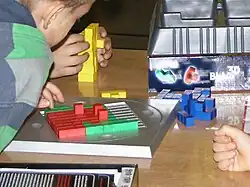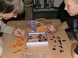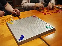 Blokus (/ˈblɒkəs/ BLOK-əs)[2] is an abstract strategy board game for two to four players, where players try to score points by occupying most of the board with pieces of their colour. The board is a square regular grid and the pieces are polyominoes. It was designed by French mathematician Bernard Tavitian[3] and first released in 2000 by Sekkoïa, a French company. It has won several awards, including the Mensa Select award and the 2004 Teacher's Choice Award. In 2009, the game was sold to Mattel.