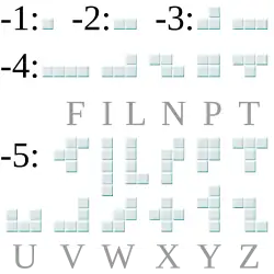 The game is played on a square board divided into 20 rows and 20 columns, for a total of 400 squares. There are a total of 84 game tiles, organized into 21 shapes in each of the four colors: blue, yellow, red, and green. The 21 shapes are based on free polyominoes of one to five squares (one monomino, one domino, two trominoes/triominoes, five tetrominoes, and 12 pentominoes). These shapes are the first in the A000105 sequence.[4]